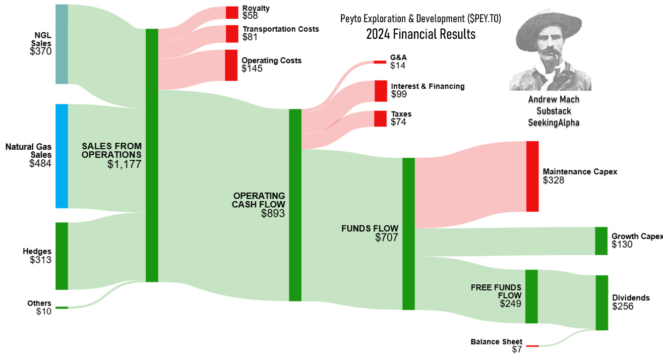 Despite 2024 being a weak year for natural gas prices, with Henry Hub averaging US$2.27, Peyto delivered record production, strong netbacks, and a solid balance sheet, all while maintaining one of the best capital efficiencies in the industry. I could talk a lot about financials, but I believe the graph below gives you more than a thousand words.